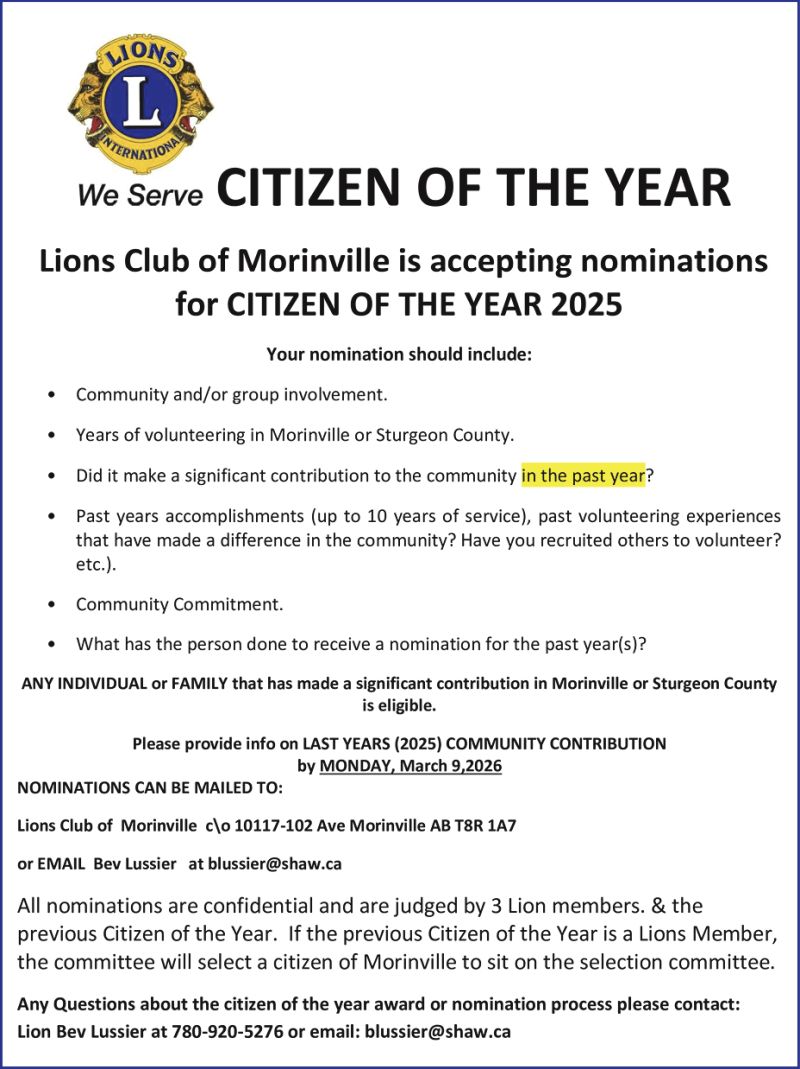 Public Notices Lions Club of Morinville admin February 25, 2026 Post navigation Previous Morinville Public School participates in Jump Rope for HeartNext Sturgeon County More Stories Public Notices Roseridge April 22, 2026 admin Public Notices Arbor Massage & Wellness April 22, 2026 admin Public Notices Sturgeon County April 22, 2026 admin