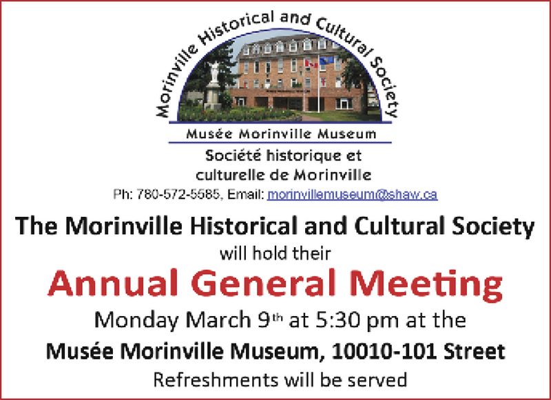 Public Notices Morinville Historical and Cultural Society admin March 3, 2026 Post navigation Previous Morinville Community Library now fine-freeNext MP Micheal Cooper and MLA Dale Nally More Stories Public Notices Roseridge April 22, 2026 admin Public Notices Arbor Massage & Wellness April 22, 2026 admin Public Notices Sturgeon County April 22, 2026 admin