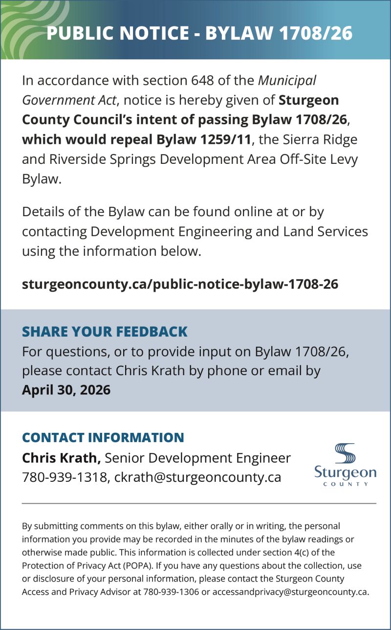 Public Notices Sturgeon County admin April 15, 2026 Post navigation Previous Target Products Ltd.Next Sturgeon County More Stories Public Notices Roseridge April 22, 2026 admin Public Notices Arbor Massage & Wellness April 22, 2026 admin Public Notices Sturgeon County April 22, 2026 admin
