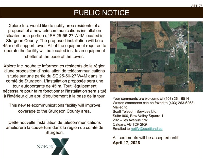 Public Notices Xplor admin March 18, 2026 Post navigation Previous TARGETNext Dale Nally engages with community during Constituency Week More Stories Public Notices Roseridge April 22, 2026 admin Public Notices Arbor Massage & Wellness April 22, 2026 admin Public Notices Sturgeon County April 22, 2026 admin
